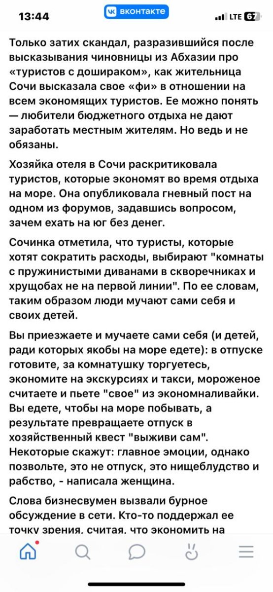 Конечно жителям курортных городов не нравится экономия гостей. Их лето весь год кормит. Но народ сейчас капитально просел. Зп на том же уровне у большинства людей, а цены далеко не на том уровне. А про курорты я вообще молчу. Там космический рост цен. Многие экономят год, чтоб 10 дней на юге побывать. Я еду в июне потому что цены меньше и не так жарко.