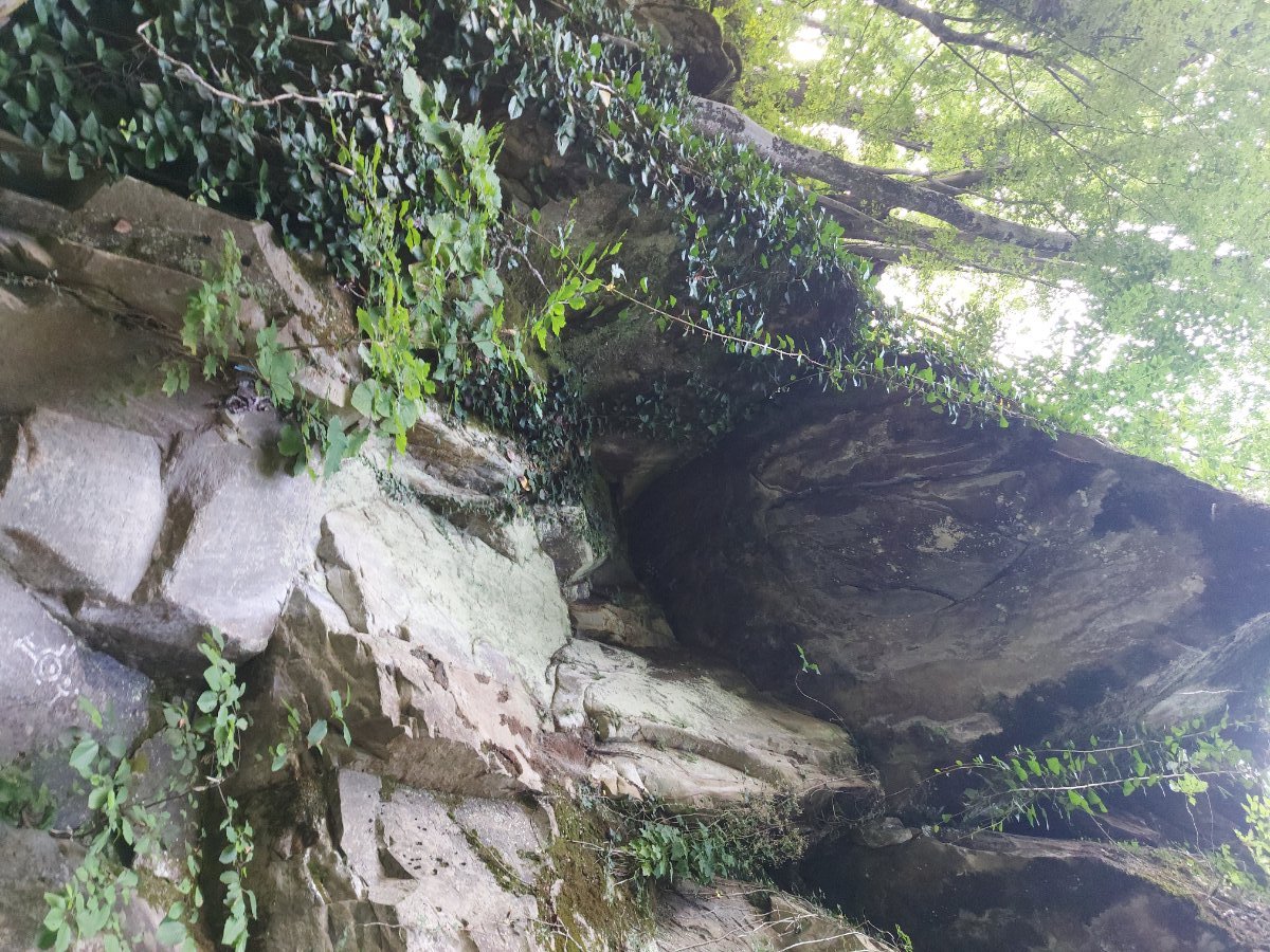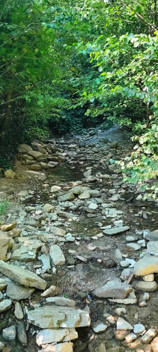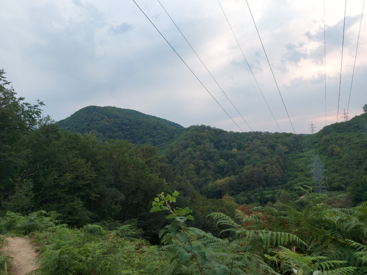 Затем пришлось вернуться обратно по тропе мимо СНТ до развилки, чтобы выйти на тропу, которая ведет в Свирское ущелье. Там, как и указано в описании из инета, тропа идет по ЛЭП. Тропа достаточно широкая, с небольшим уклоном. Я там поскользнулась и чуть не убила телефон. Тропа ведет к водопаду Тещины слезы. К лунному камню, дольмену и водопаду Адам и Ева не пошли, т.к. ранее бывали в Свирском и в этот раз времени у нас уже было мало, да и все таки устали. Поэтому просто пошли вниз к выходу из ущелья.