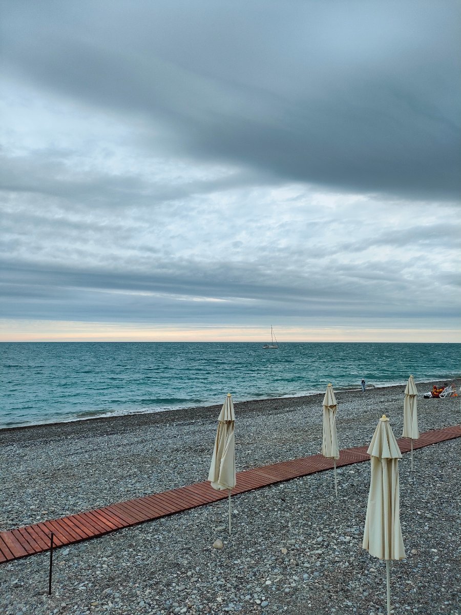 Сегодня погода успела поменяться много раз... Утром было солнце и тепло, потом набежали тучи, подул пронизывающий ветер. Море волновалось все время... Ещё через минут 30-40 вышло солнце и снова тепло и без ветра. Сейчас опять тучи и ветер ... Вот такая круговерть:unsure::ag: