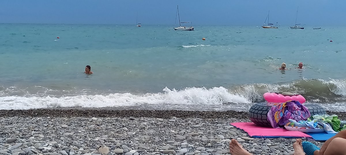 Сегодня после обеда облачно и ветрено. На море волнение - заходить для меня и плавать непросто, но попрыгать на волнах очень даже прикольно. И при выходе море само подталкивает к берегу :ag: