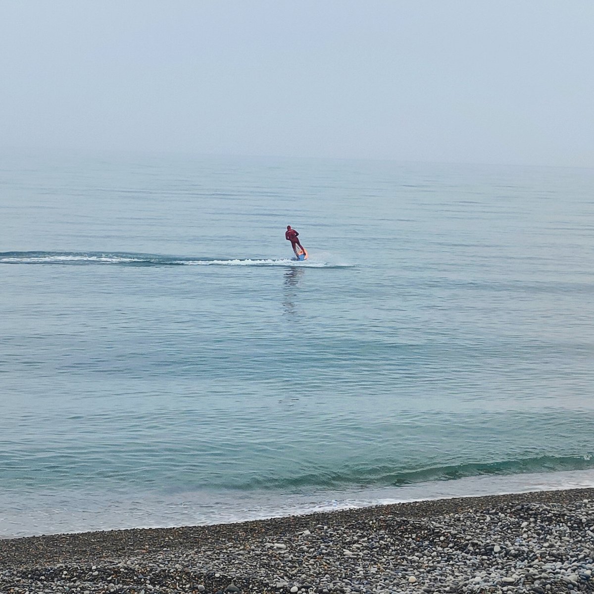 Море сегодня спокойное, увидела вот такого сёрфера, он так круто шел вдоль берега. И судя по тому, что он в гидрике с капюшоном, вода холодная