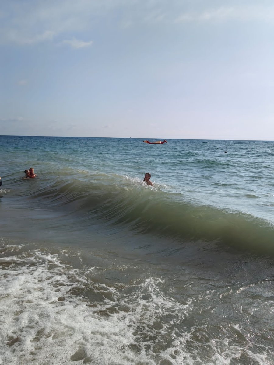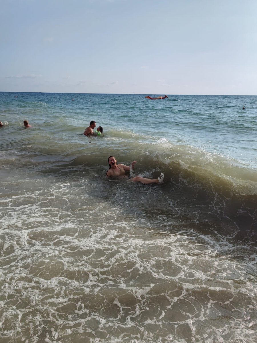 Сегодня такие волны были, заливало вплоть до лежаков. Кто был ближе к морю с полотенцем и  подстилками, всех залило и им пришлось ретироваться. Море сильно волновалось и было мутным.