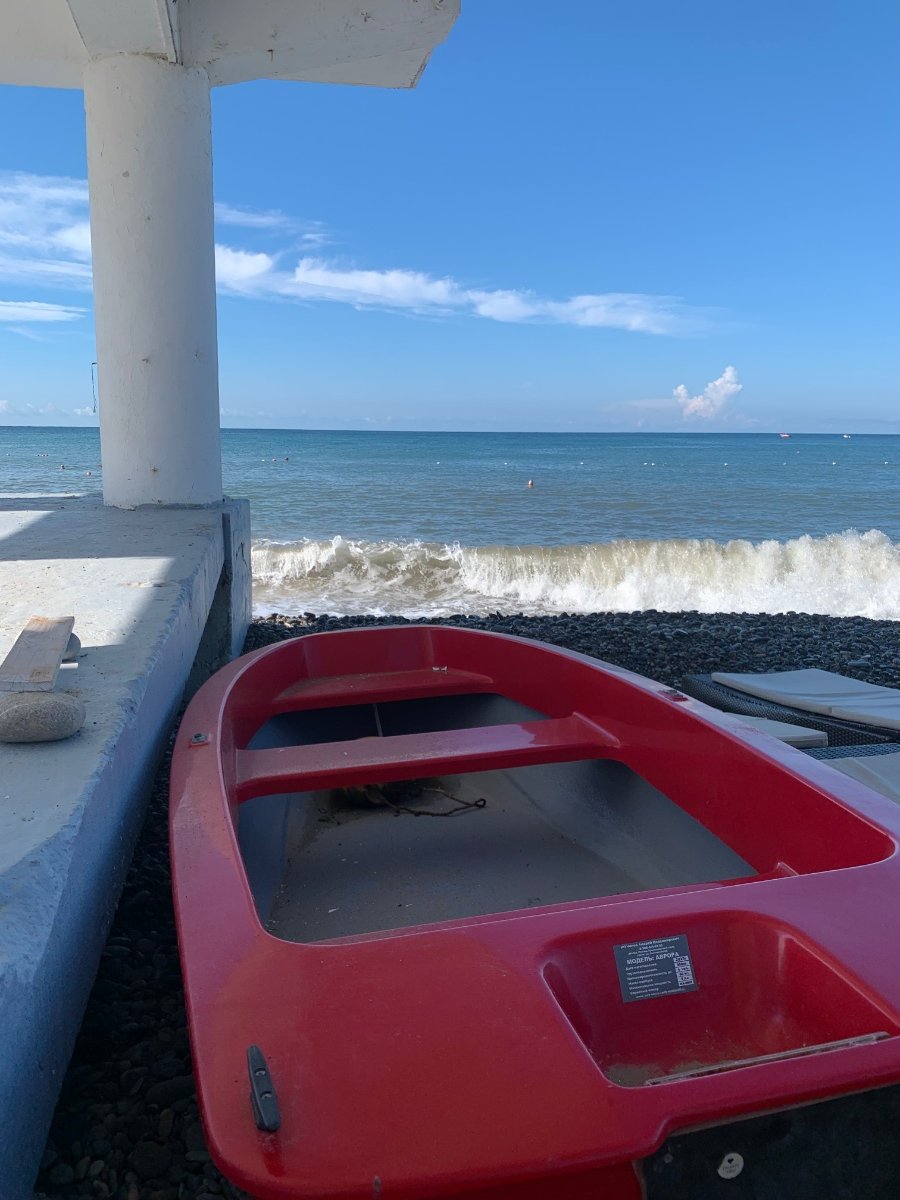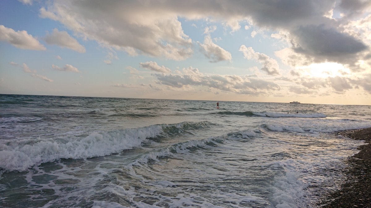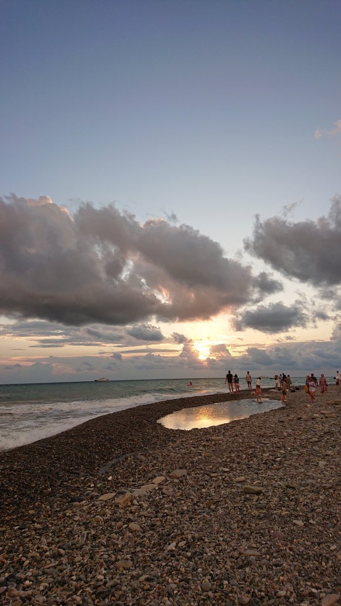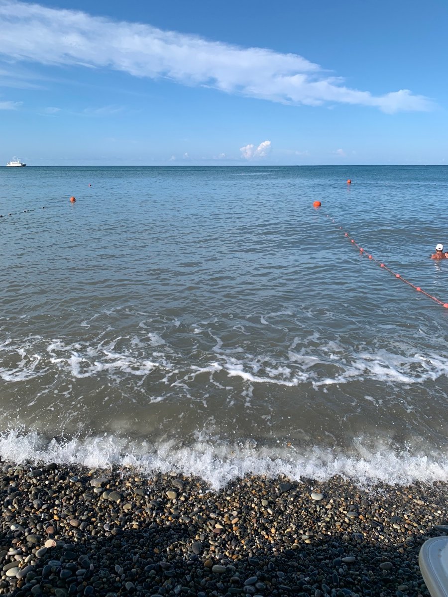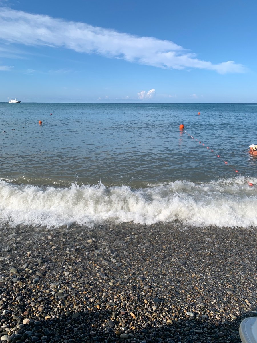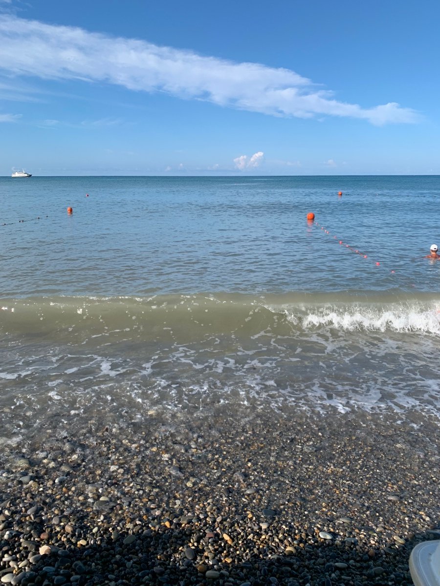 Море волнуется, шумит камнями. Волны такие же, как и вчера. Но  мы были вдвоем и я купалась. Сейчас одна. Только ноги помочила. Вода… ну, в первый секунд «ах!», потом - да норм :)) мутная только