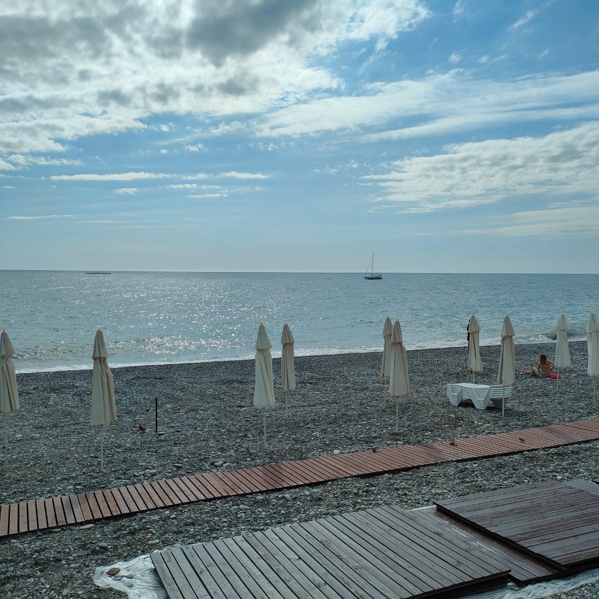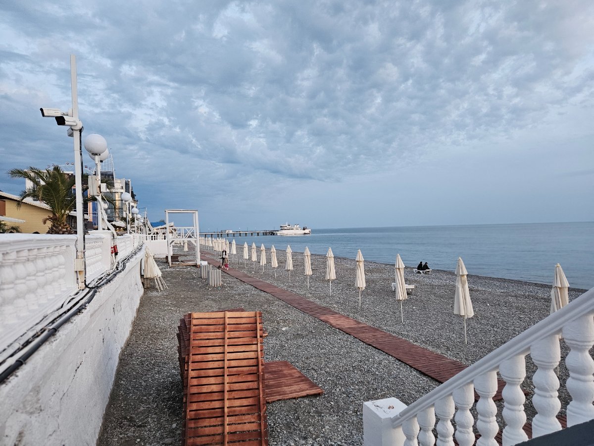 Пляж уже практически готов к сезону. Постелили дорожки, поставили зонтики.