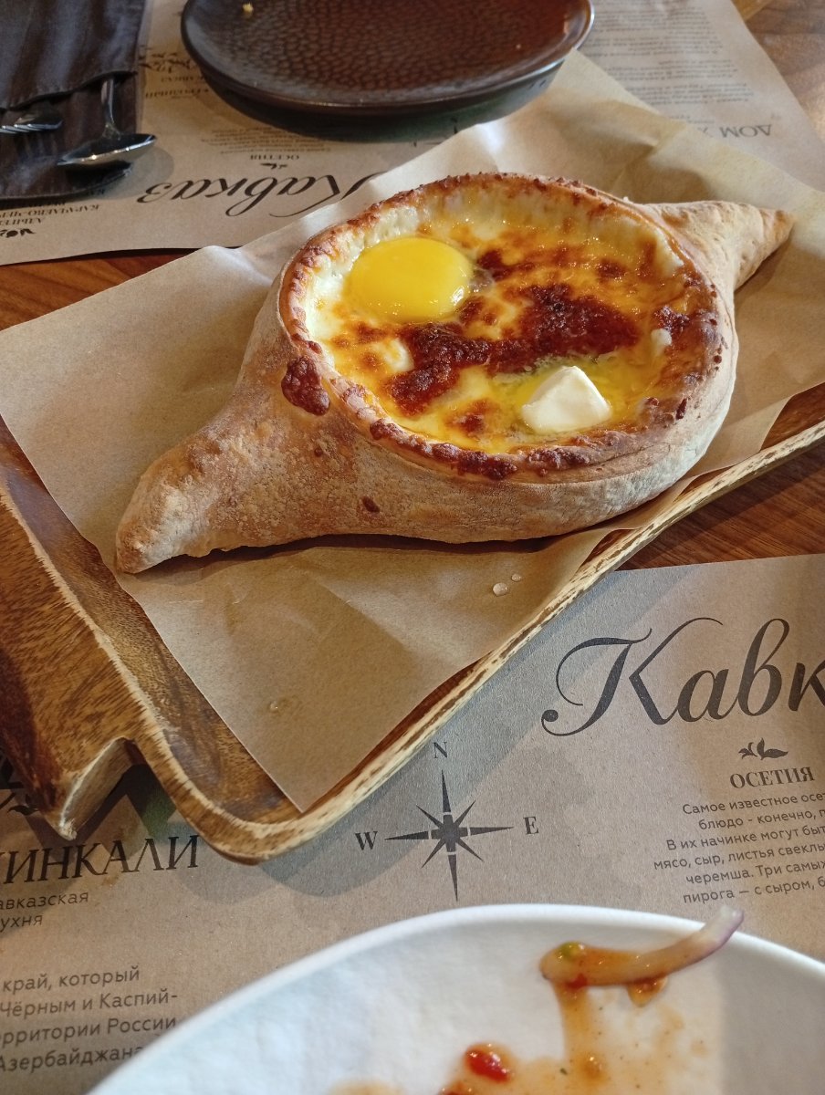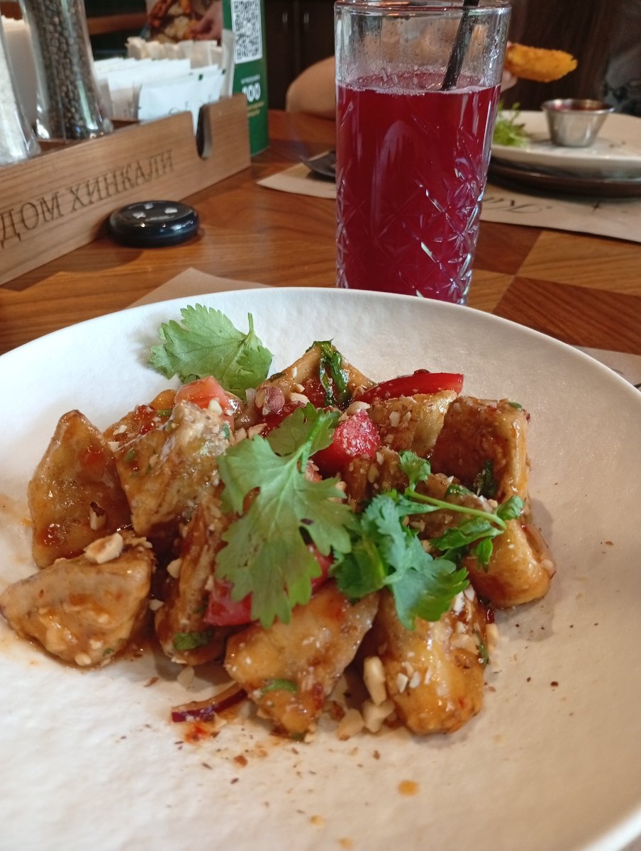 Был еще жареный сулугуни с каким-то сладким соусом, и, собственно, хинкали. Всё очень вкусно, приветливо, достаточно быстро. Нам там очень нравится!