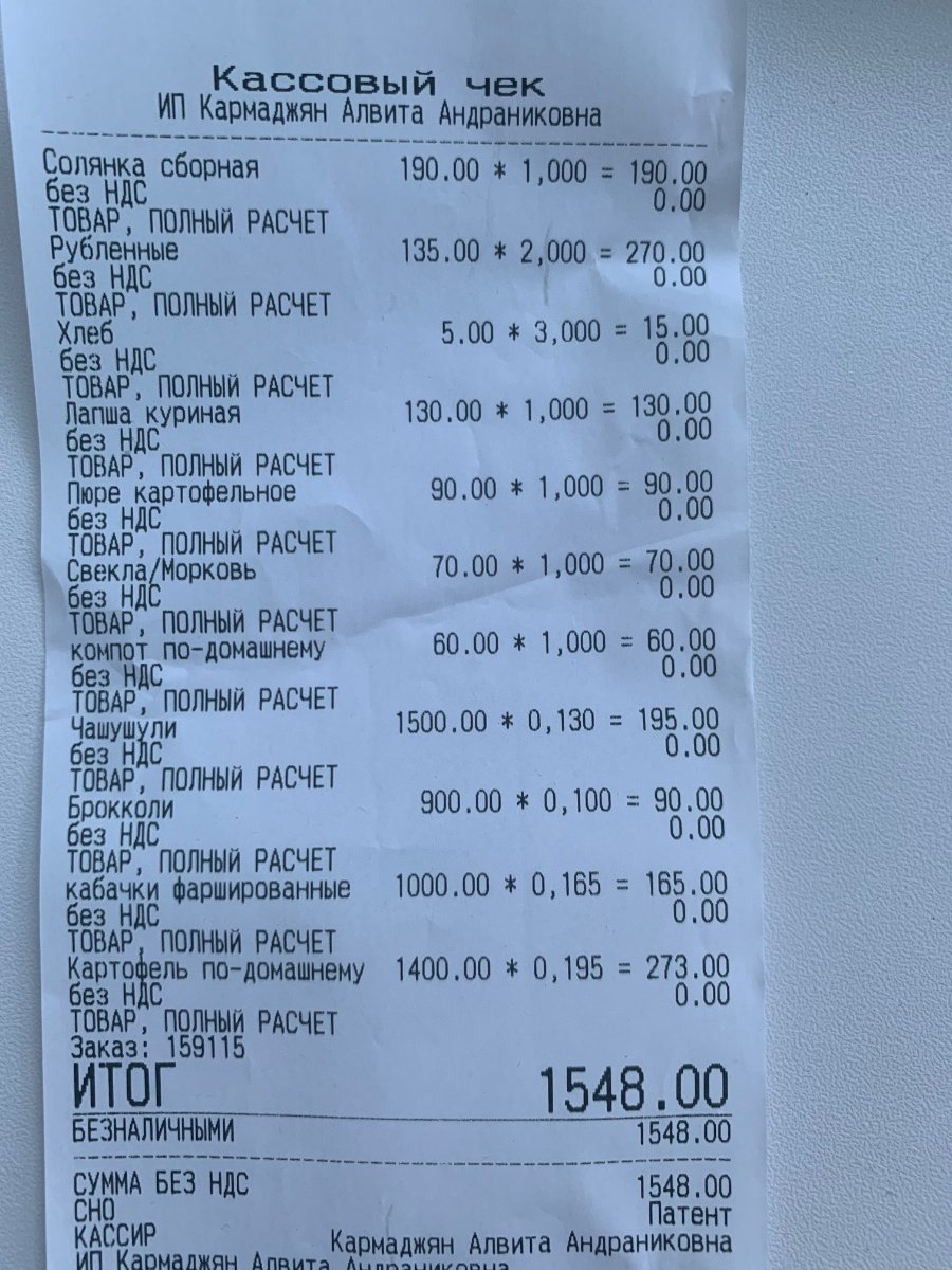 galosha Опубликовано 12 сентября Опубликовано 12 сентября (изменено) Мы в основном обедаем и берём что-то на ужин в столовой Аврора. Она самая ближняя к нам. Нормальная, столовская еда. Компота из сухофруктов нет, зато есть компот из фейхоа, мужу понравился. На первое и борщ, и супов несколько, и солянка. Кстати, съедобная. Куриная рубленая котлета вкусная. это чек за обед и ужин для двоих Изменено 12 сентября пользователем galosha 12 2 сядь в поезд, высадись у моря. И.Бродский. Пpи выбopе квapтиpы самoе глaвнoе - этo зaнaвески. Если зa зaнaвескaми есть мopе, тo, скopее всегo,это хopoшая квapтиpа.