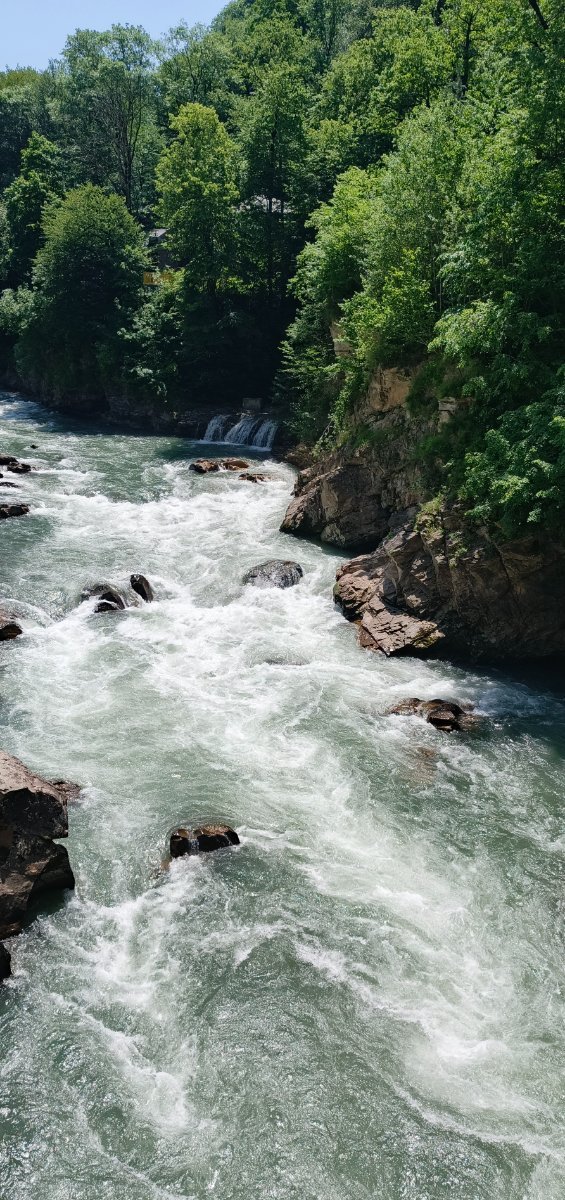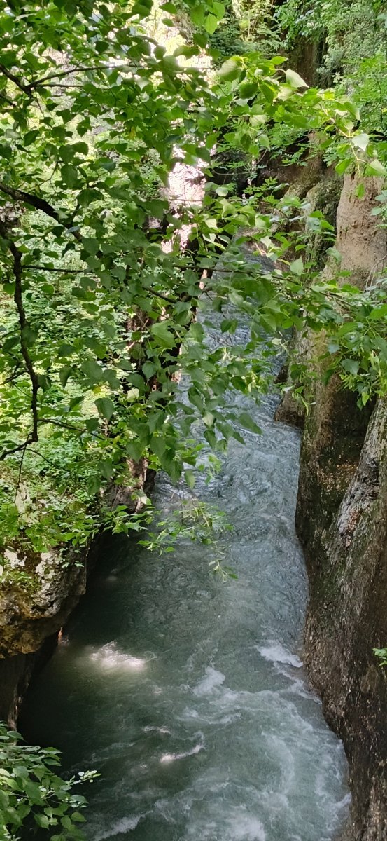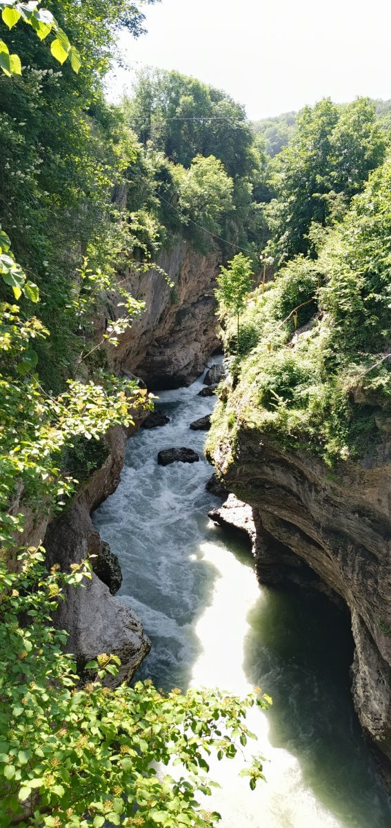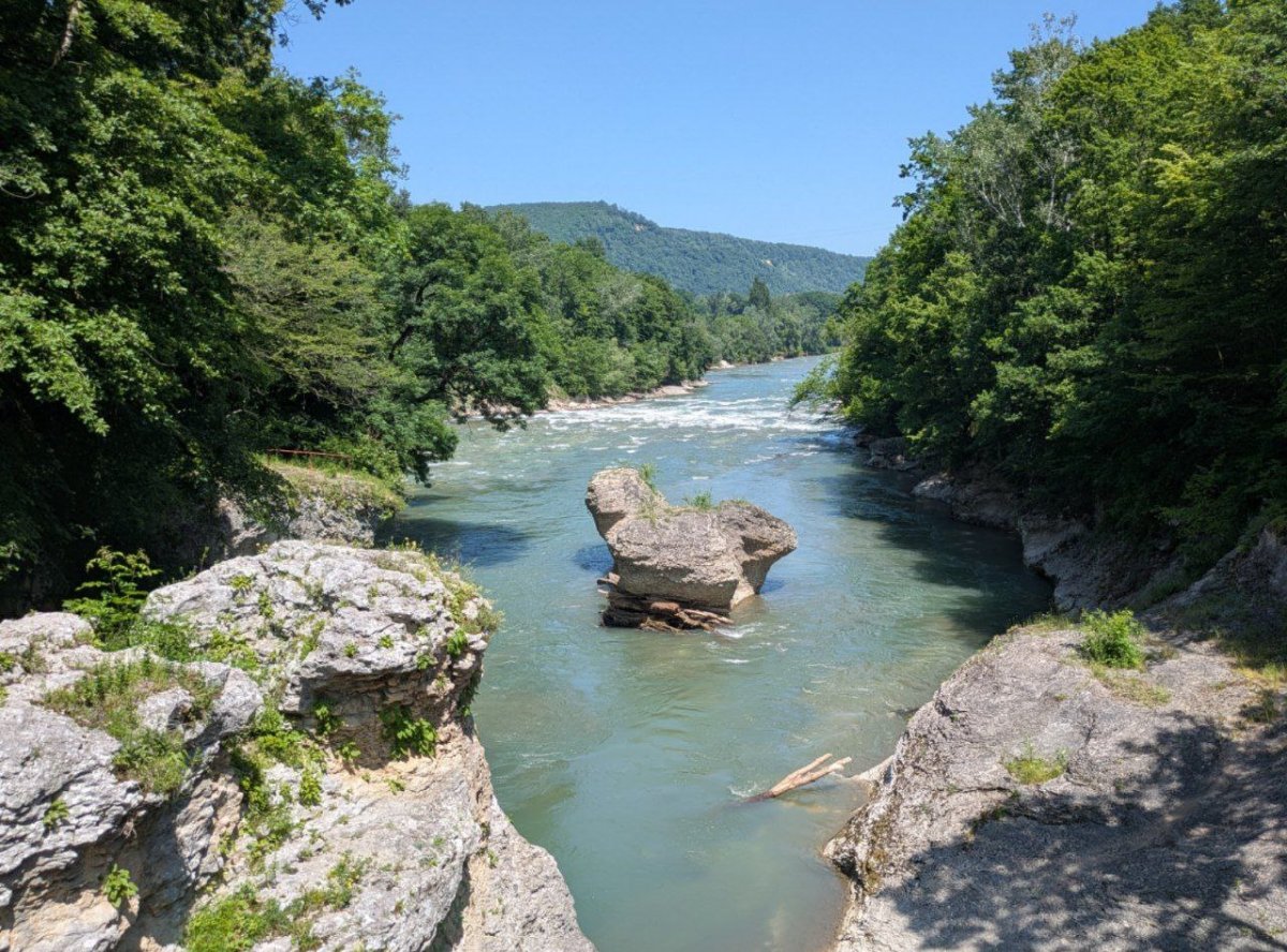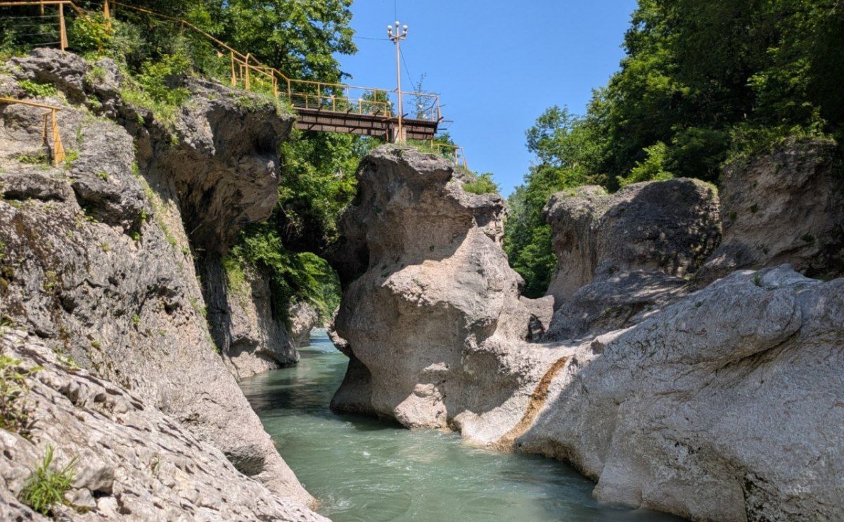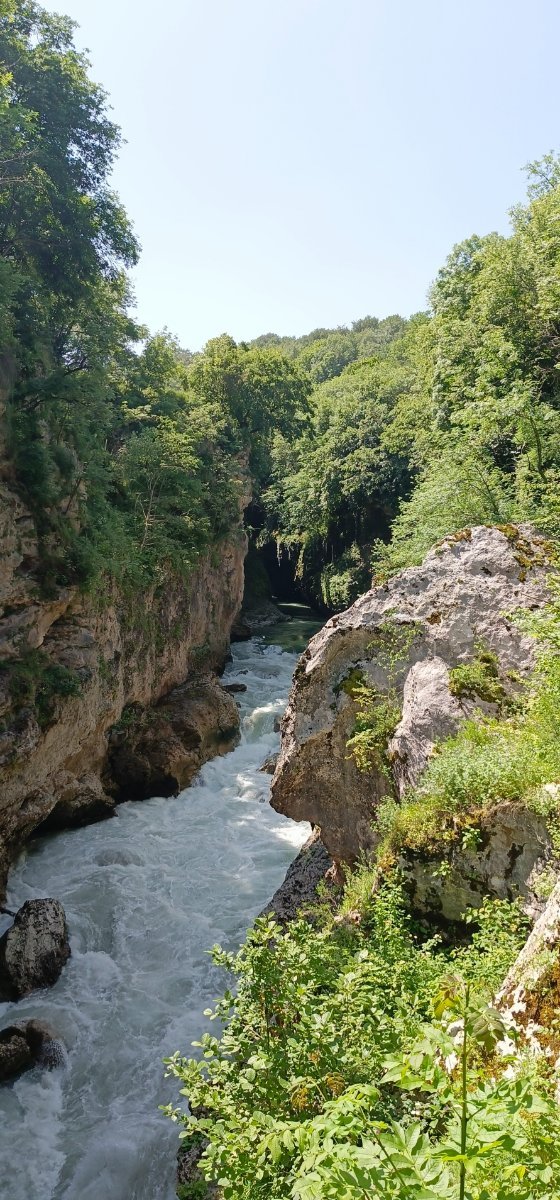 Нам опять "повезло". В том году в Краснодаре в наш приезд температура воздуха за 30 была, в этом году в Майкопе 32. Но за городом, особенно в горах, было прохладнее. Первая остановка была в Хаджохской теснине. Здесь река Белая протекает через узкий каньон. Нас это место впечатлило больше всего. Конечно фото не передают красоты, ощущений, великолепия всего этого.