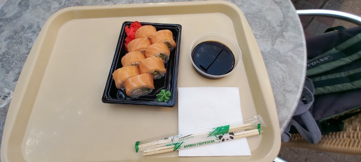 Сегодня, в заключительный день в Лазаревском, зашли в Пингвин попробовать-таки роллы ))) Я взяла Филадельфию с креветками. 470 р., 15 мин. ожидания и - вот